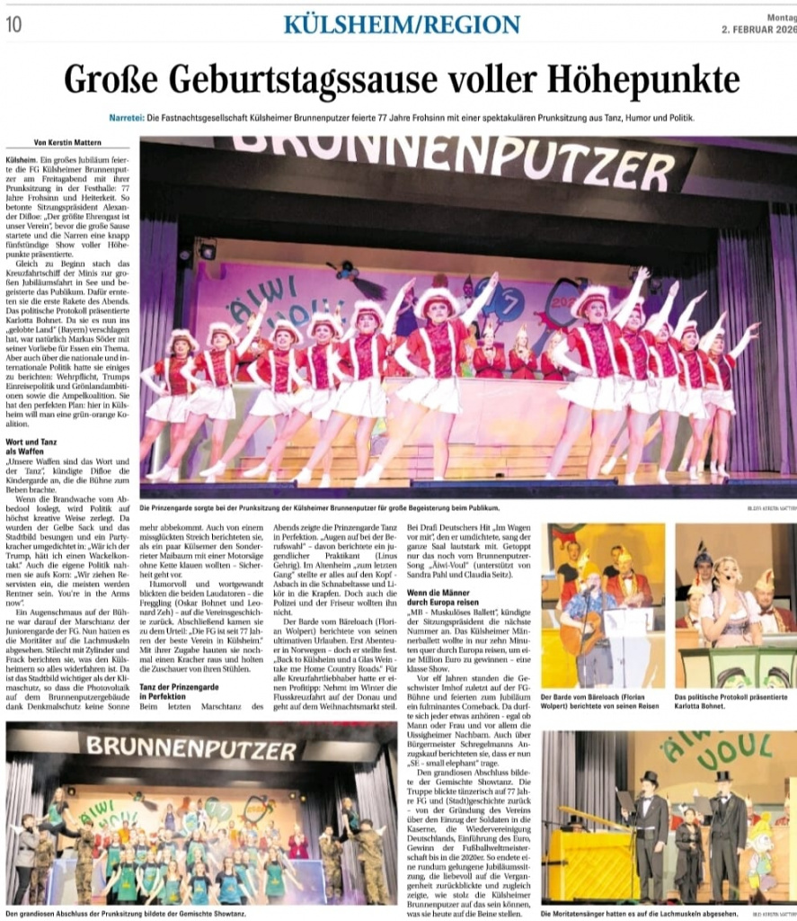 Liebe Brunnenputzer, wir haben schweren Herzens in der Vorstandschaft beschlossen, unsere öffentlichen Fastnachtstermine und die Prunksitzungen aufgrund der Coronapandemie abzusagen. Die Gesundheit ALLER geht uns vor!